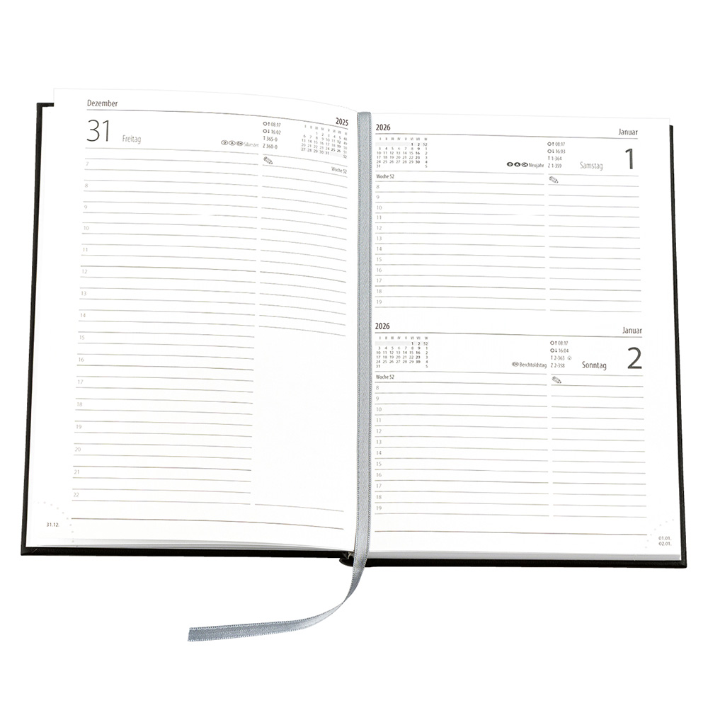 Ferientermine D/A/CH Jahres- und Monatsübersichten Monatsvor- und -nachlauf Tages- und Zinszählung Sonnenauf- und -untergang Große Auswahl an verschiedenen Einbandmaterialien und Farben |